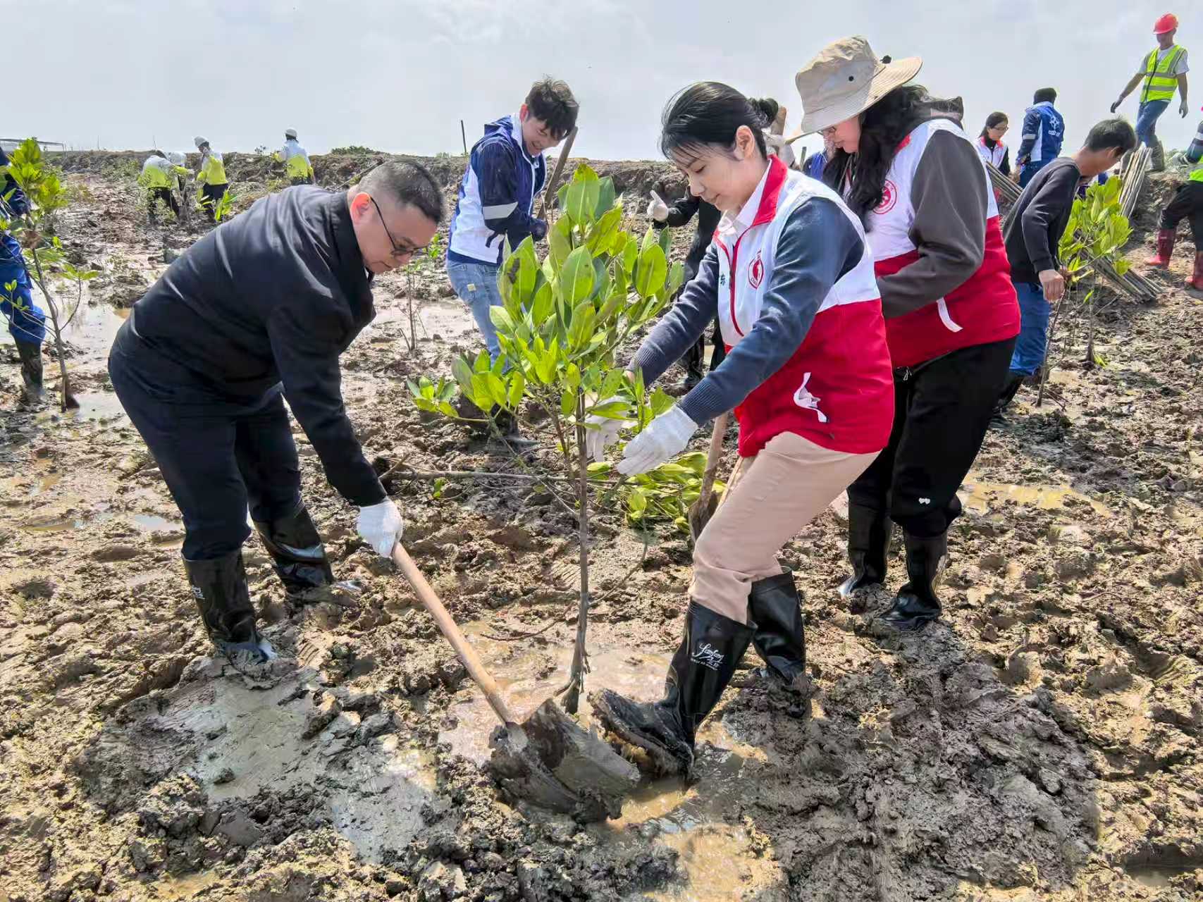 11时许,志愿者们继续前往湛江经开区红树林湿地生态修复系统治理项目基地,与中交四航局第三工程有限公司员工共同学习红树林知识与种植技术。随后,全体人员按小组分工开展植树实践。志愿者们精神饱满、有序协作,携手栽下一株株红树林苗木,为湛江经开区红树林湿地生态修复工程注入新绿,增添盎然生机。