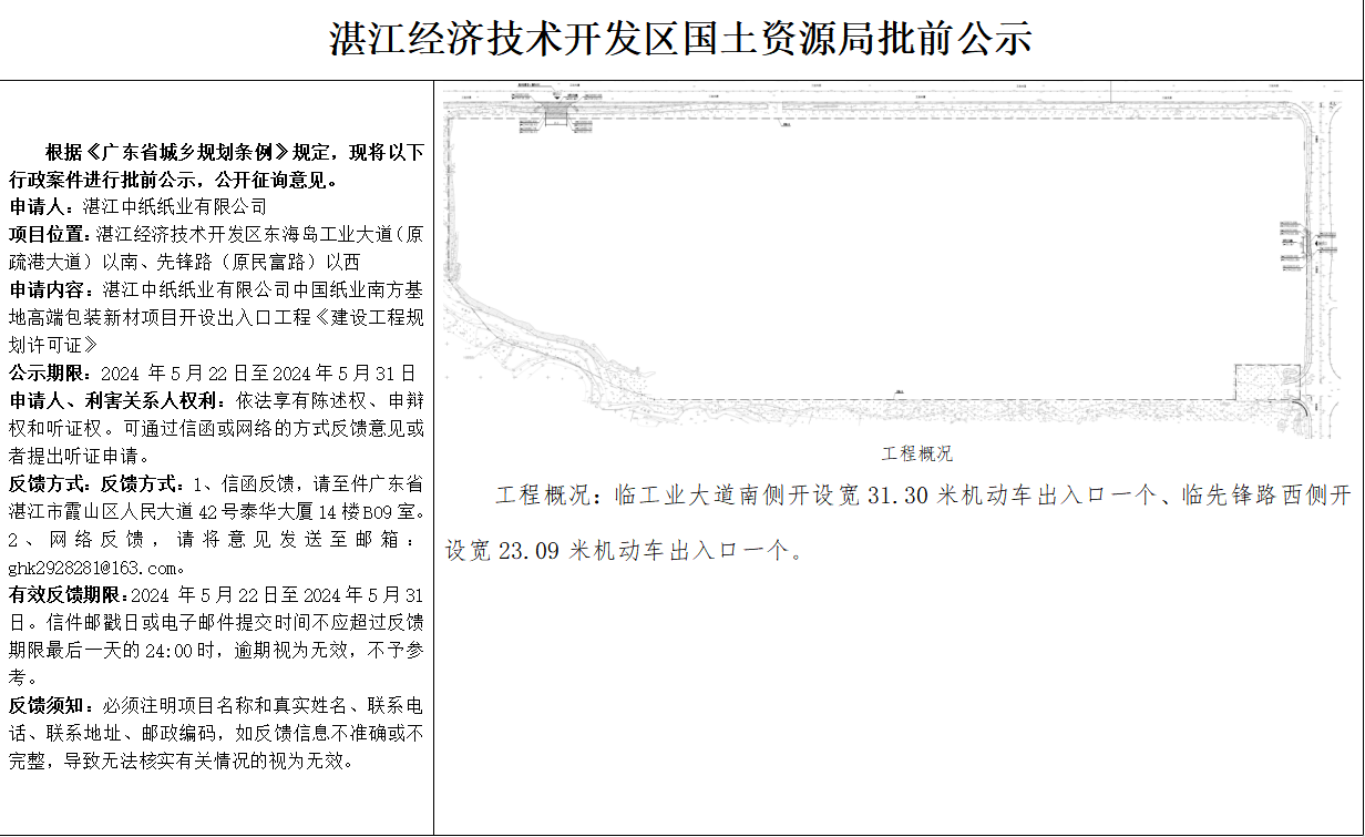中国纸业南方基地高端包装新材项目开设出入口工程《建设工程规划许可证》公示